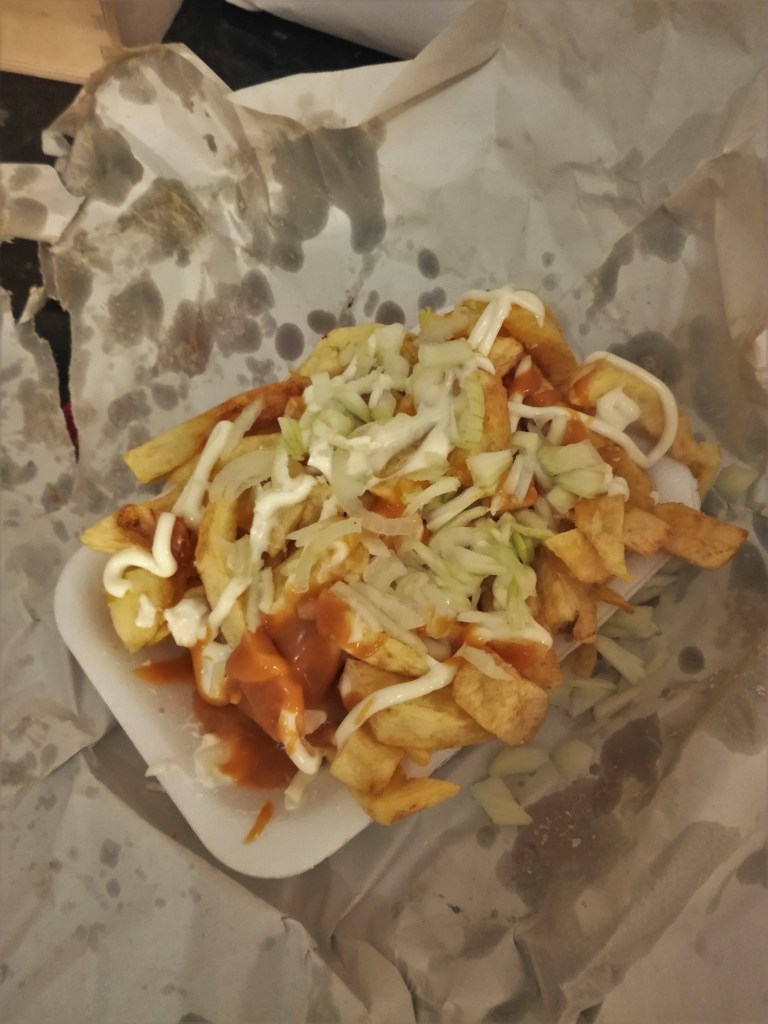 It’s been two full days since I actually had a change of clothes, drifting about in a bathrobe like a secure-wing patient. Hair’s a thatch and a big red zit mars the chin. I’ve resolved to go out for dinner, to make some Dutch-Indonesian chips, an invention from immigrants on that side of the Channel. Chips from the Chippy, which I’ll ladle with peanut sauce, mayo and raw onion.