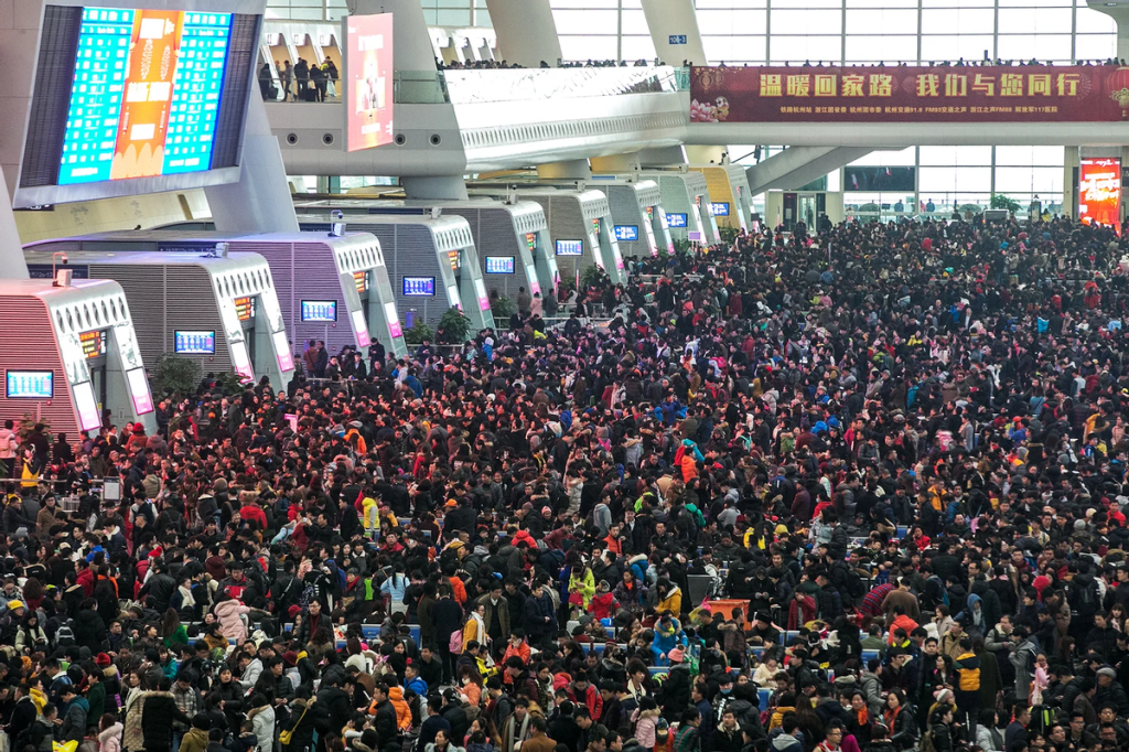 Normally CNY is planned expertly -all tickets sold online, well beforehand. Every terminal built like an airport with stadia capacity, and 700 extra train routes put on as millions cross the country to their homesteads, notably 400 million ex-ruralites. However when bad weather hits, and staggers departures, as seen in the 2017 blizzards, the knock-on effect can be terrifying.